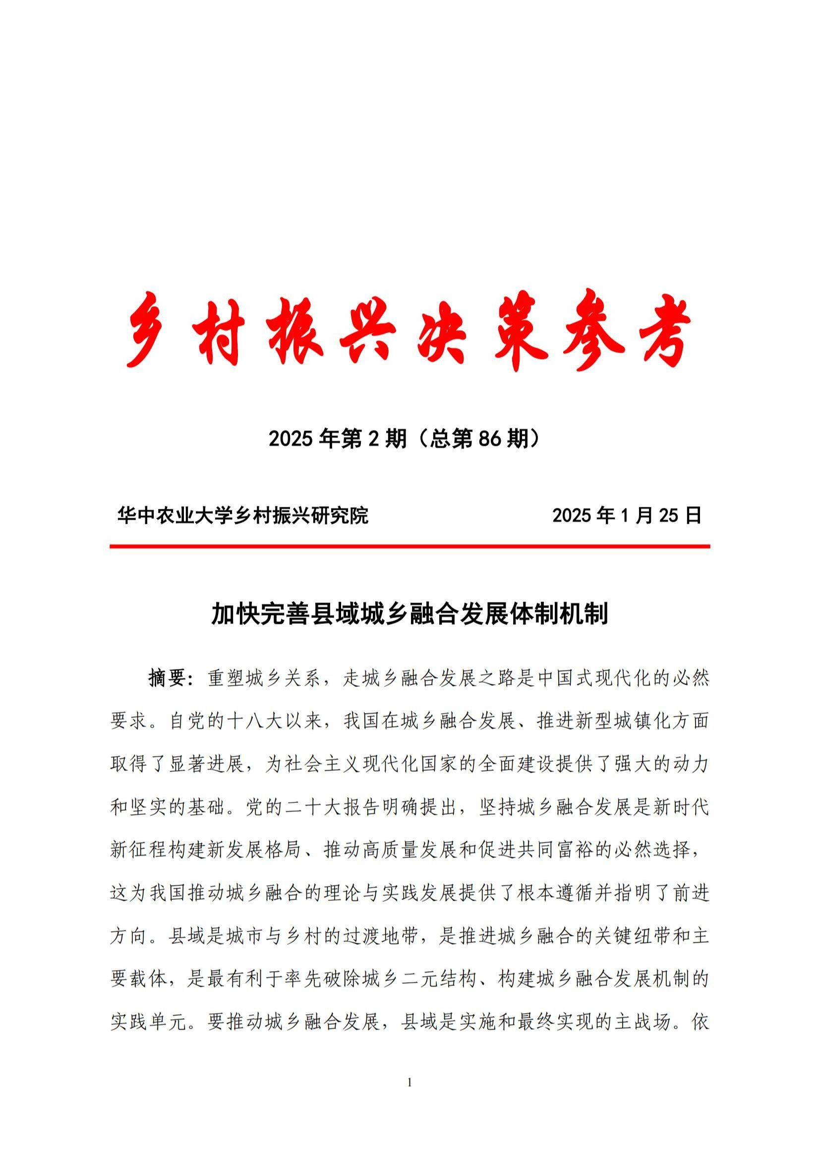 乡村振兴决策参考2025年第2期(总第86期)加快完善县域城乡融合发展体制机制
