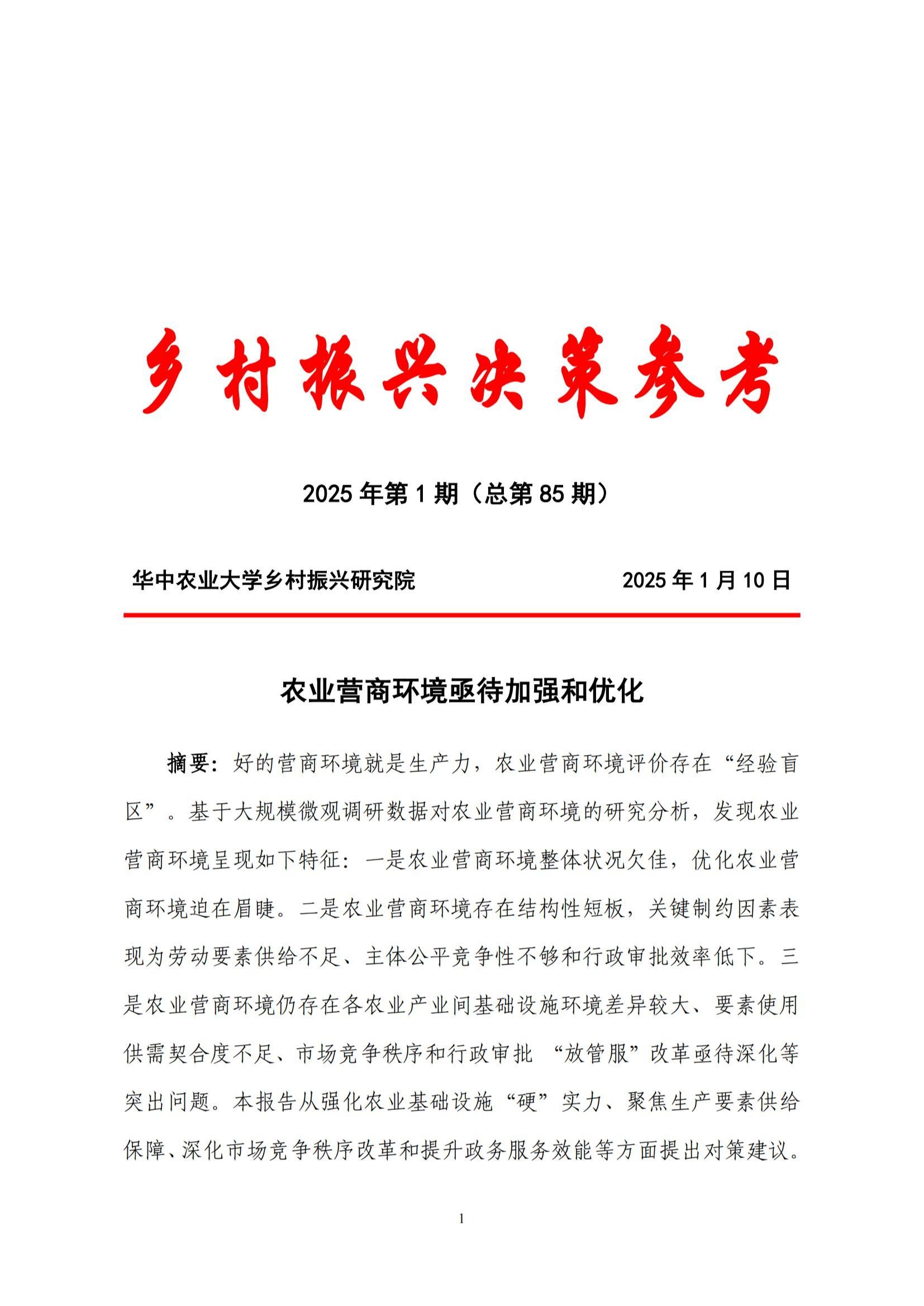 乡村振兴决策参考2025年第1期(总第85期)农业营商环境亟待加强和优化