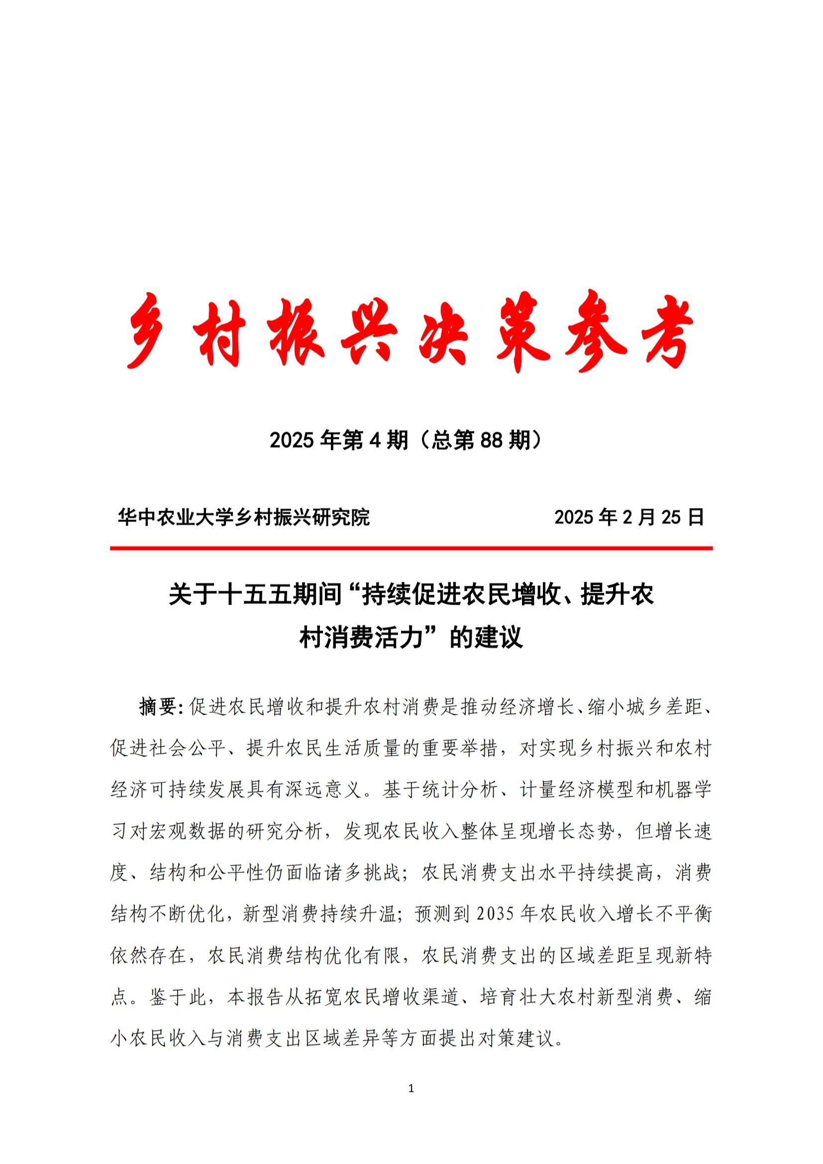 乡村振兴决策参考2025年第4期(总第88期)关于十五五期间“持续促进农民增收、提升农村消费活力”的建议